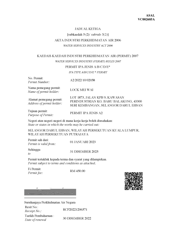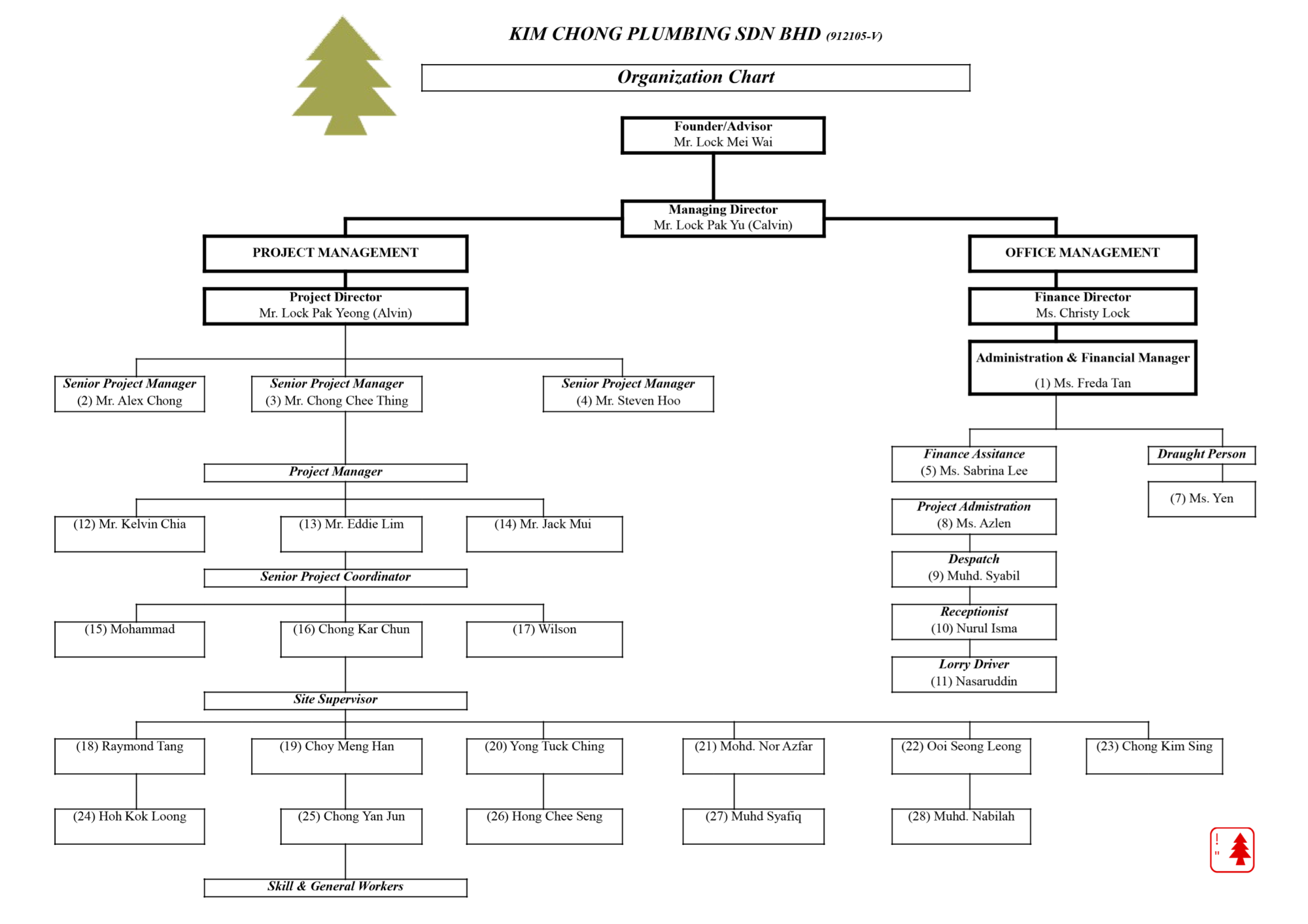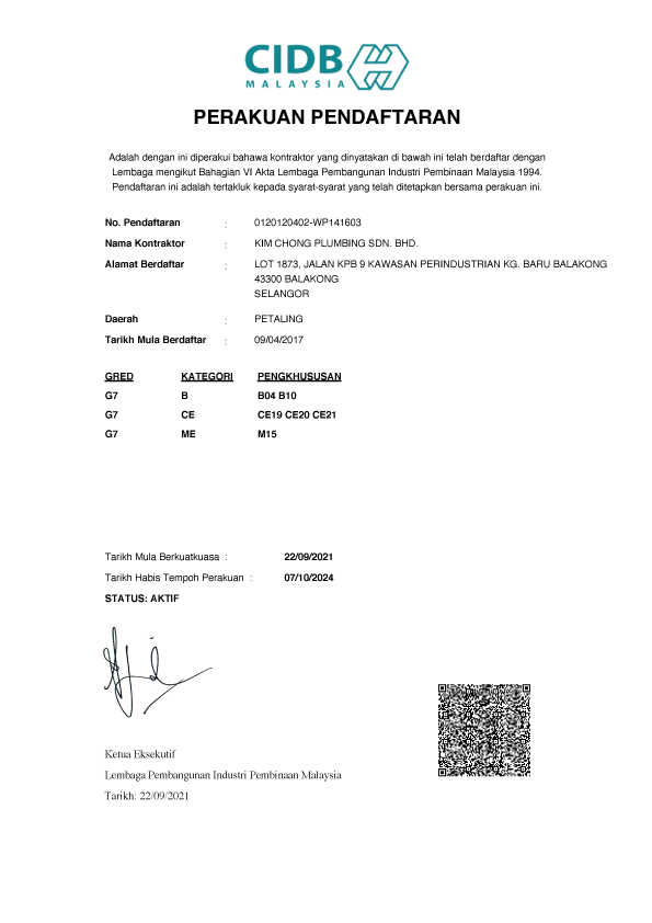 KIM CHONG PLUMBING SDN. BHD. registered as partnership on 18th August 2010 by Mr. Lock Mei Wai & Mr. Calvin Lock Pak Yu. Company paid-up capital and authorize capital are now RM 750,000.00.